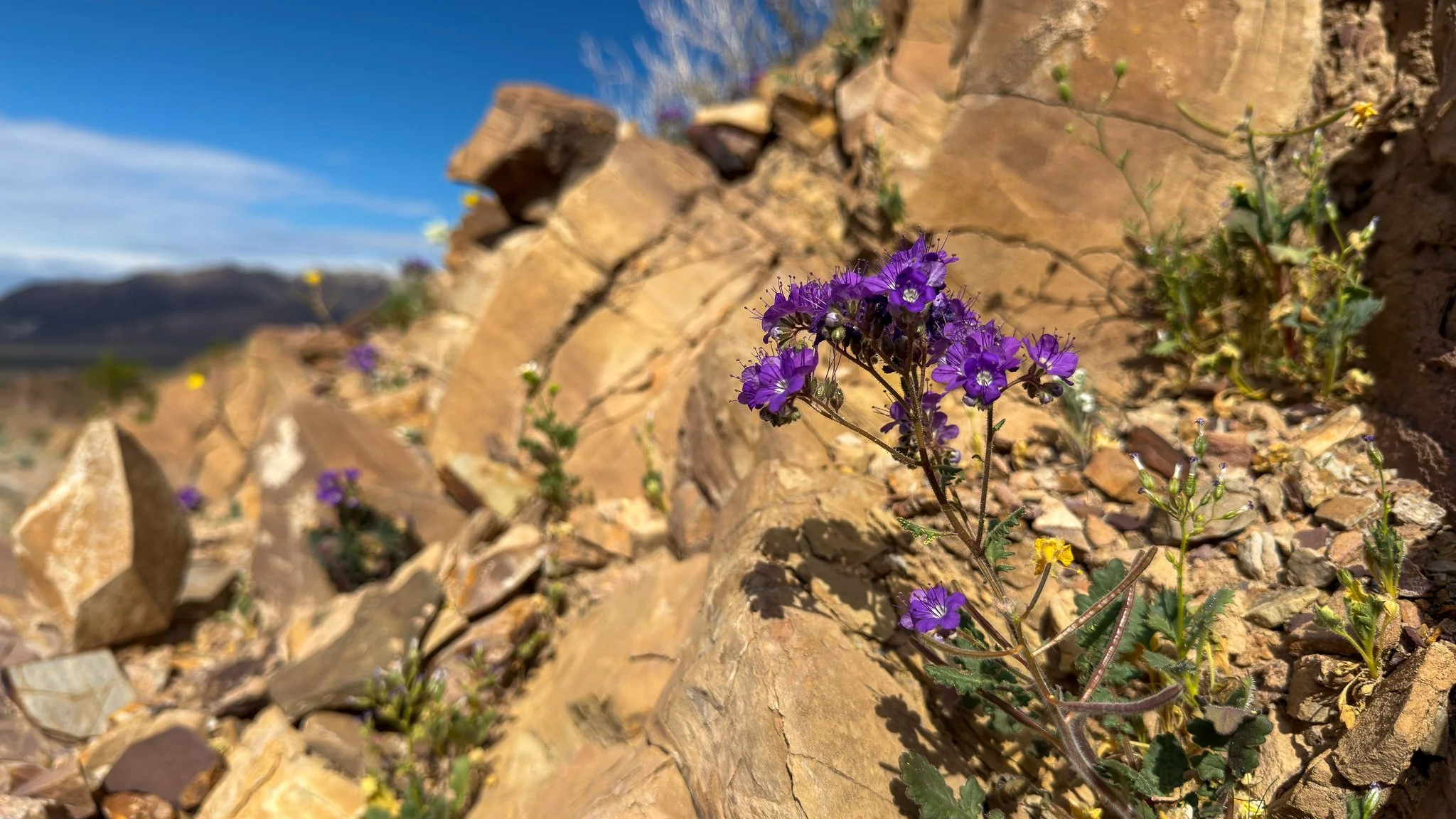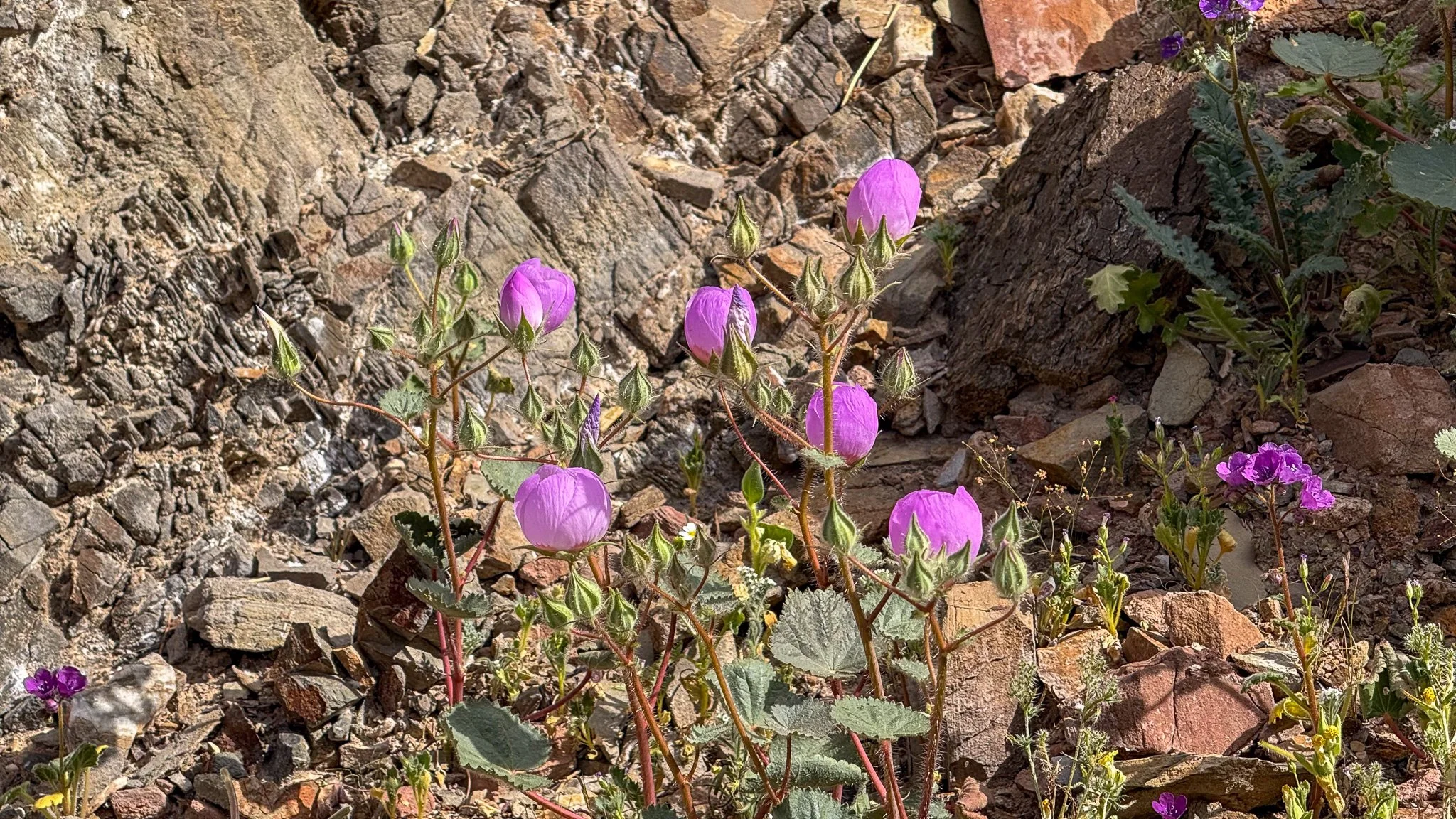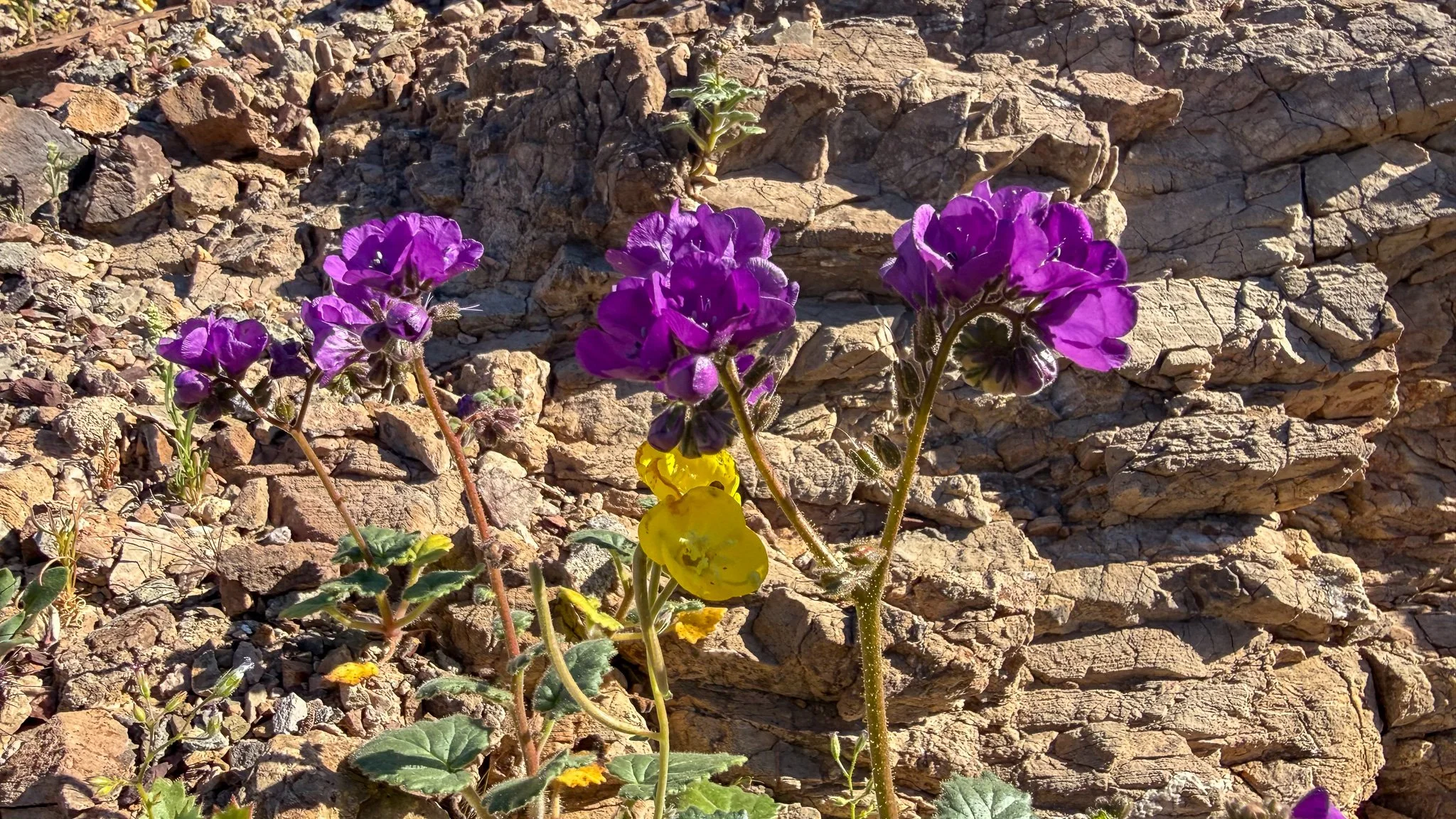 Notch-leaf Scorpionweed (Phacelia crenulata) on the wall of the arroyo.