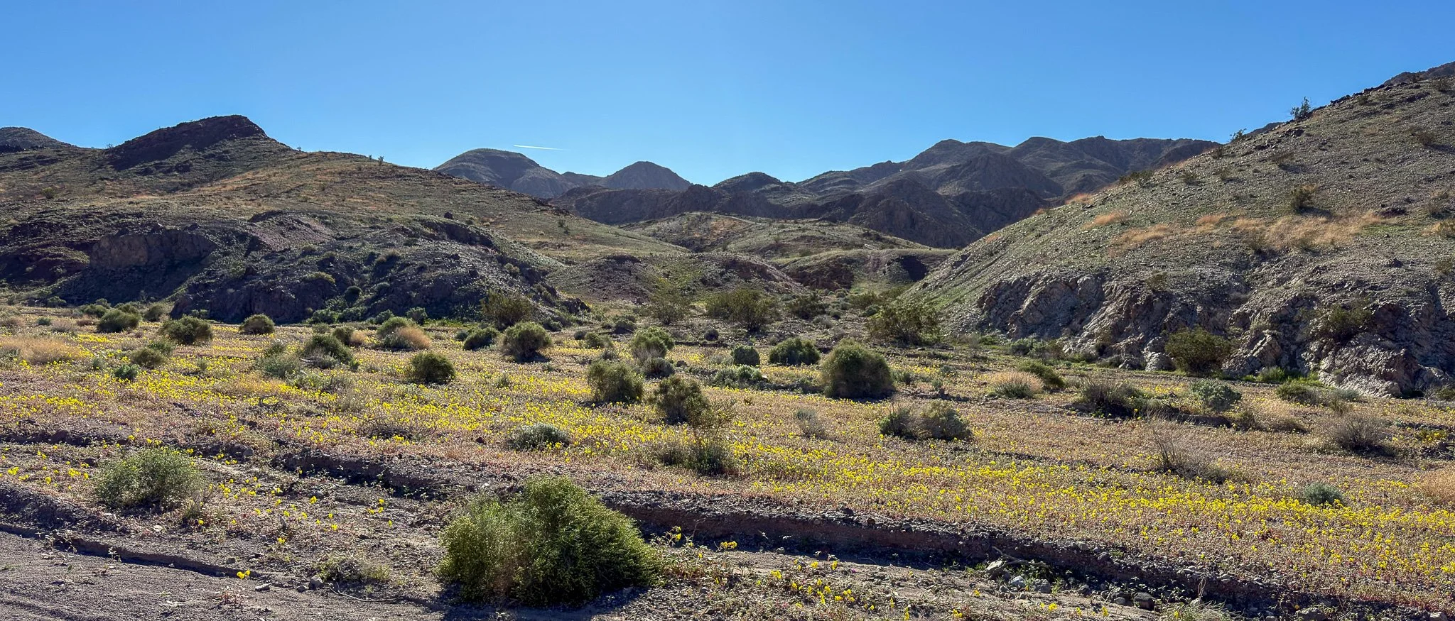 February 16, 2026 — Stella and I decided to take a short recovery hike (we had a big adventure run on Valentine’s Day) before the storms moved in. We headed to the Saddle Peak Hills, one of our favorite wilderness areas in the region. We parked the Jeep off Ibex Spring Road near BM JRH16 (35.76323N, -116.36318W) and headed up a faint old mining road on the south side of the road. We had to do some seriously route finding just to get across the wash because we wanted to avoid trampling the developing superbloom.