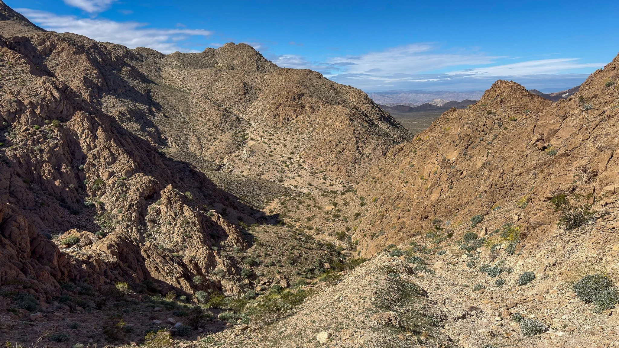 We reached the end of the arroyo at (.7537, .3495) el 1785 with great views of the namesake Saddle Peak Hills and, looking south, we spied some nice wide draws to explore next time. We turned back and made our way back to the trailhead. We actually missed the road exit from the arroyo and overshot a bit, but found a crossover using one of the other parallel arroyos that feed down into Ibex Wash.